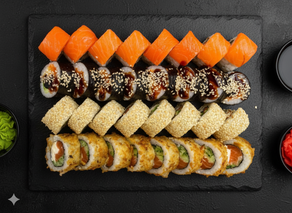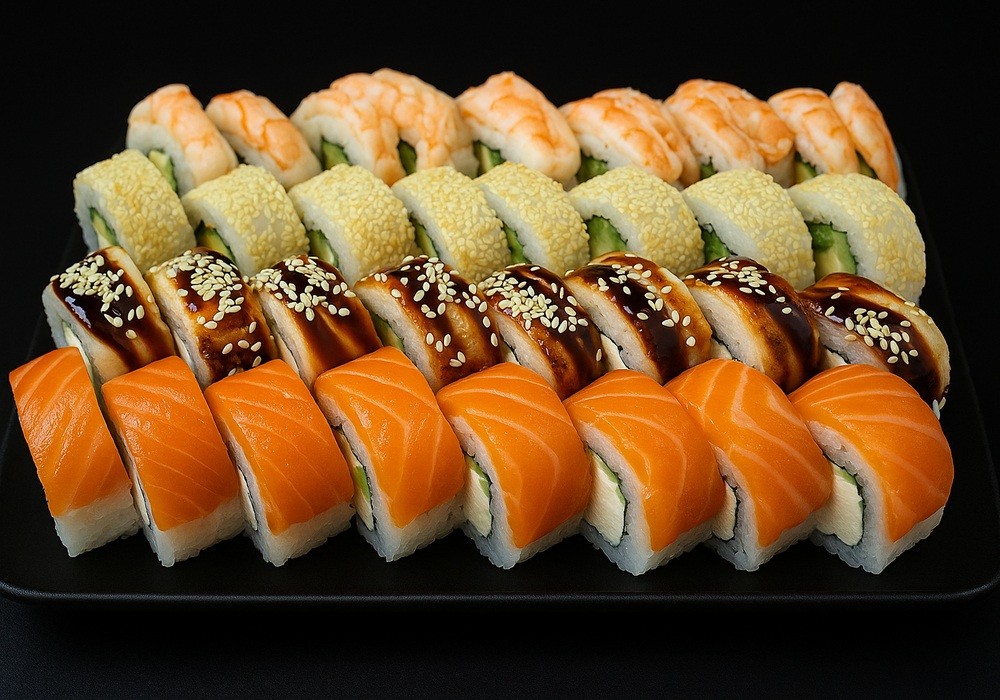 Рис,сир, норі, лосось, вугор, ікра масаго.