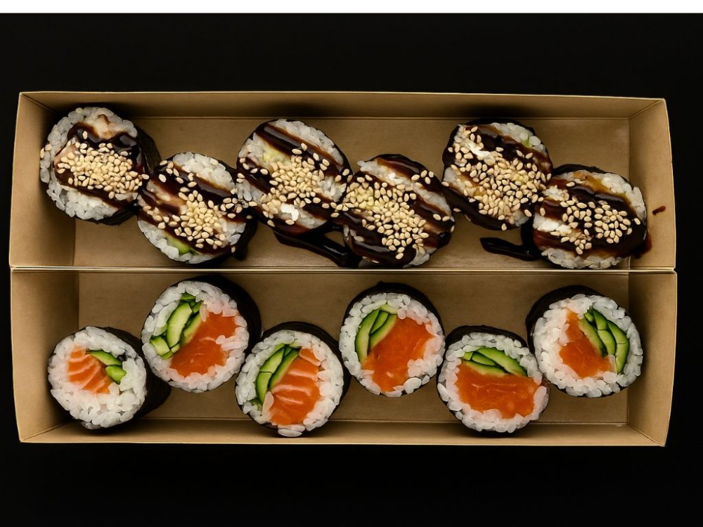 Макі лосось ( норі, лосось, огірок, рис)Макі вугор ( норі, вугор, огірок, сир, рис, кунжут, унагі соус)