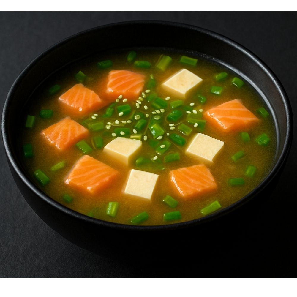 Рибний бульйон, вакаме, лосось, сир тофу, рисова локшина, зелена цибуля, кунжут. Вага: 385 г.